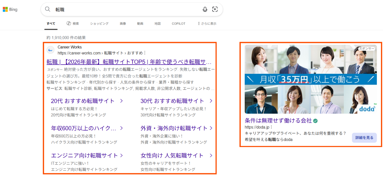 検索広告は、ユーザーがBingなどの検索エンジンで入力したキーワードに応じて表示される広告です。意図が明確なユーザーにアプローチできるため、CV獲得率が高くなりやすい傾向があります。主な特徴は次の通りです。
