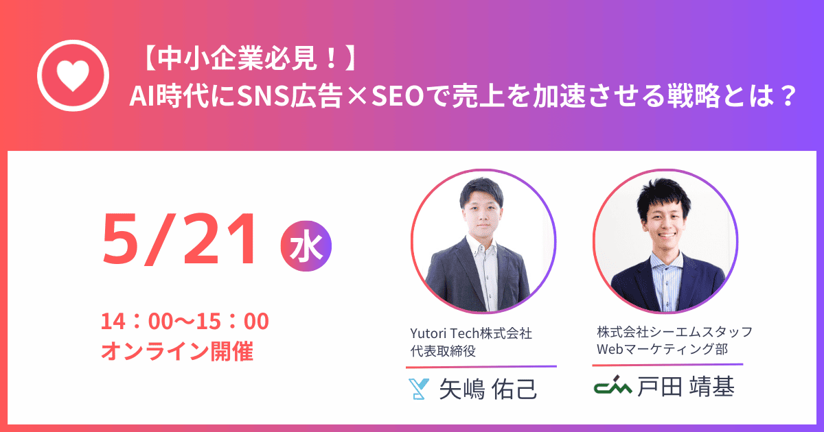 登壇するのは、SNS広告運用で数多くの企業を支援してきた株式会社シーエムスタッフとSEO対策を専門とするYutori Tech株式会社。